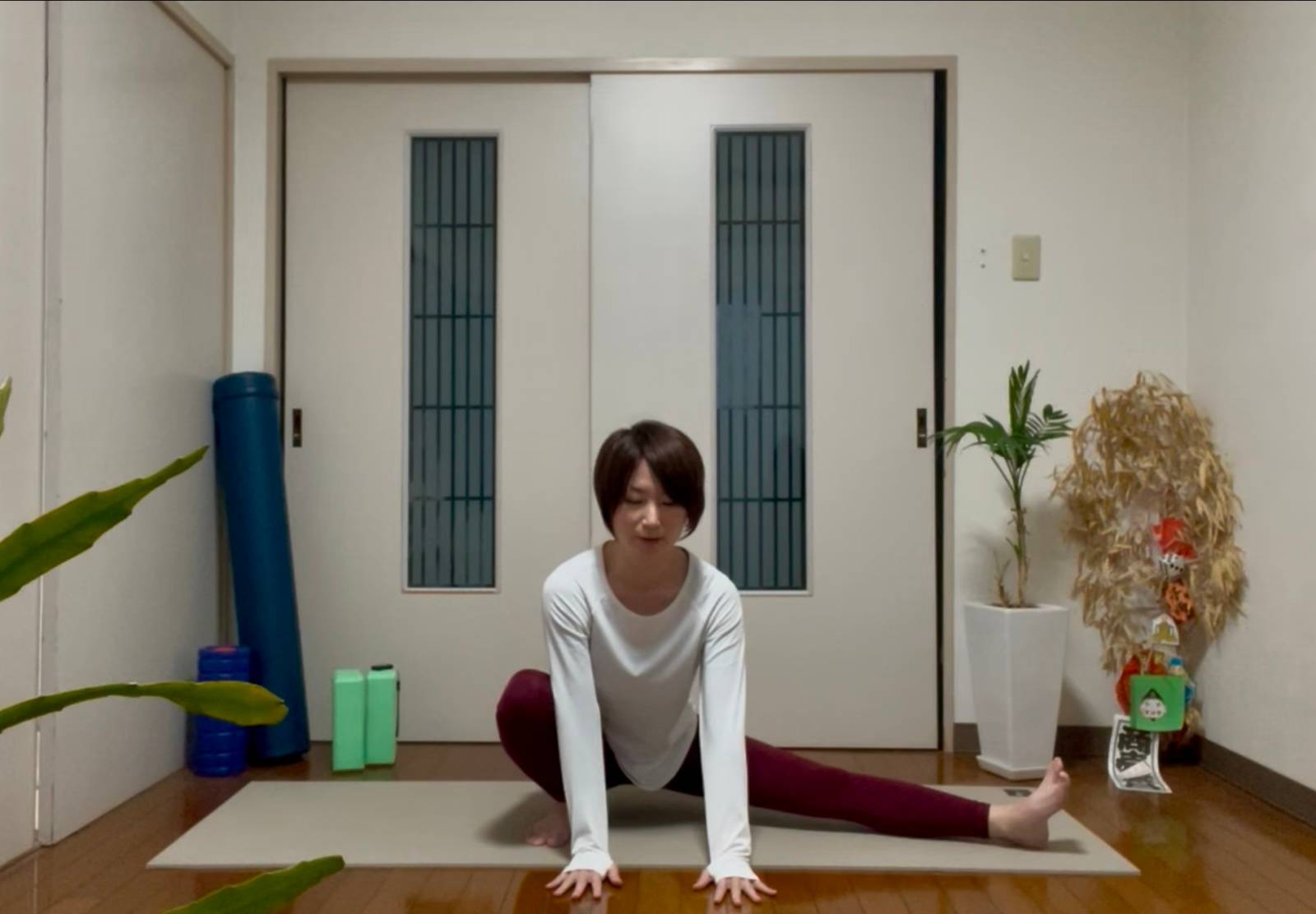 両手を床に下ろし、背中を伸ばして、呼吸を続けながら30秒ほどキープをします。