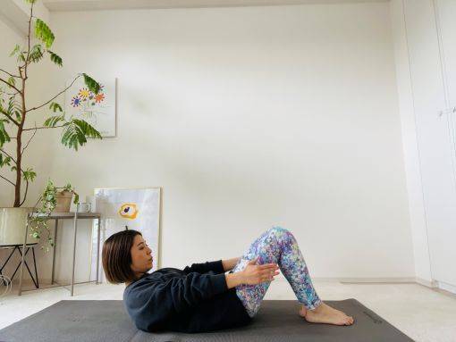 2)息を吐きながらお腹の力を使い上半身を起こす。首の力で起きると辛くなるので注意しましょう