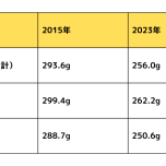 近年、日本人の野菜摂取量が減少しています。厚生労働省による「国民健康・栄養調査」の結果をもとに、20歳以上の1日あたりの平均摂取量を2015年と2023年で比較してみましょう。