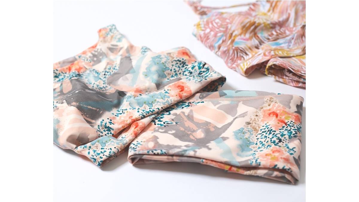 流れるようなタッチが羽根を思わせる「カラフルフェザー」は、ヨガや日常のコーディネートに彩りを添えてくれる柄です。