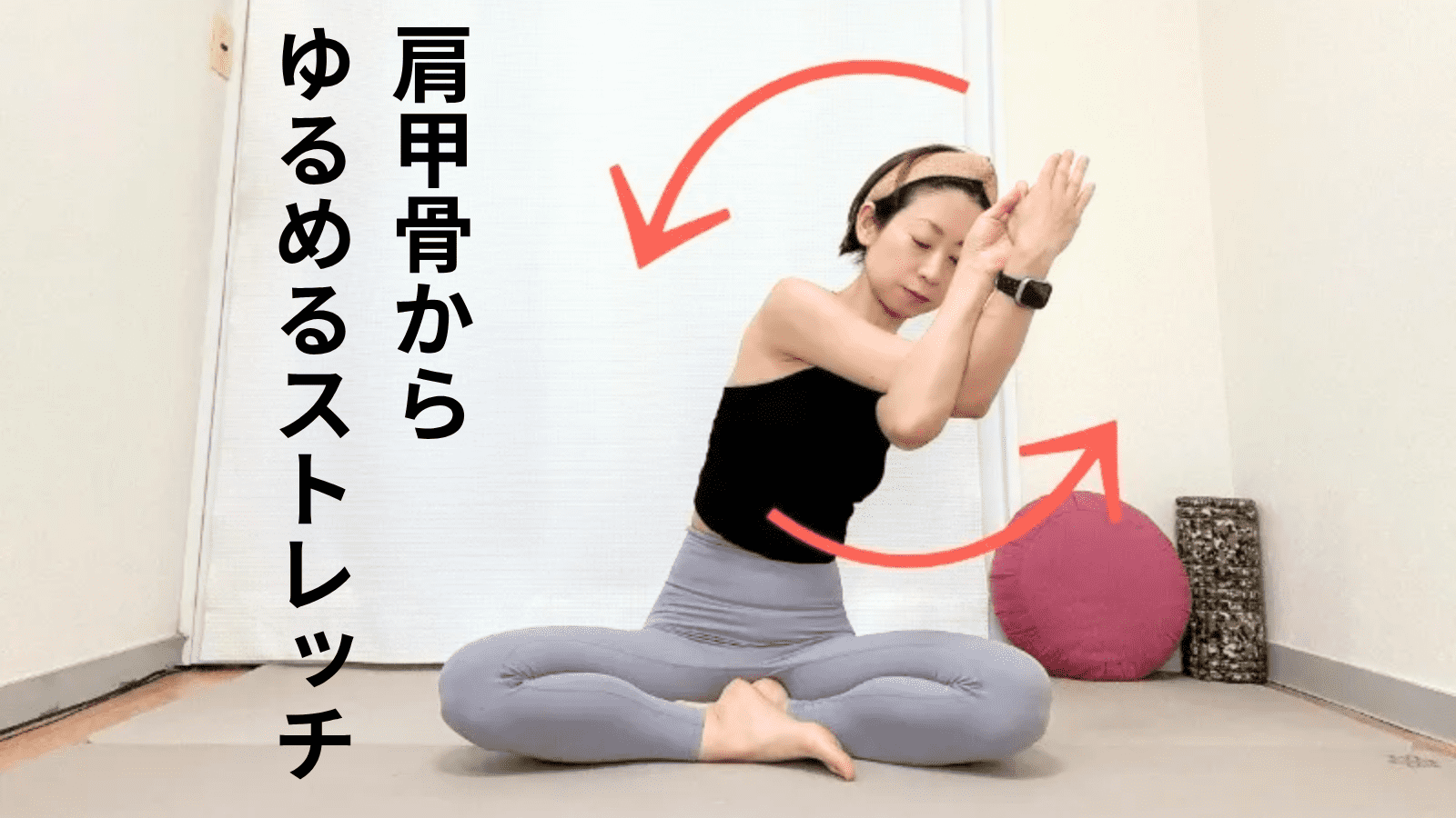 イーグルポーズの腕の形で行う、座ってできるストレッチです。イーグルアームに動きを加え、背中の血流を促しながら肩甲骨まわりの緊張をほどきましょう。