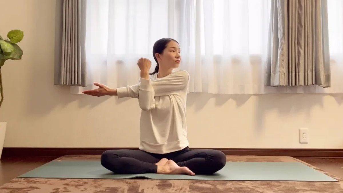 1.楽な姿勢で座り、指先同士を絡めて手首を満遍なく回す。