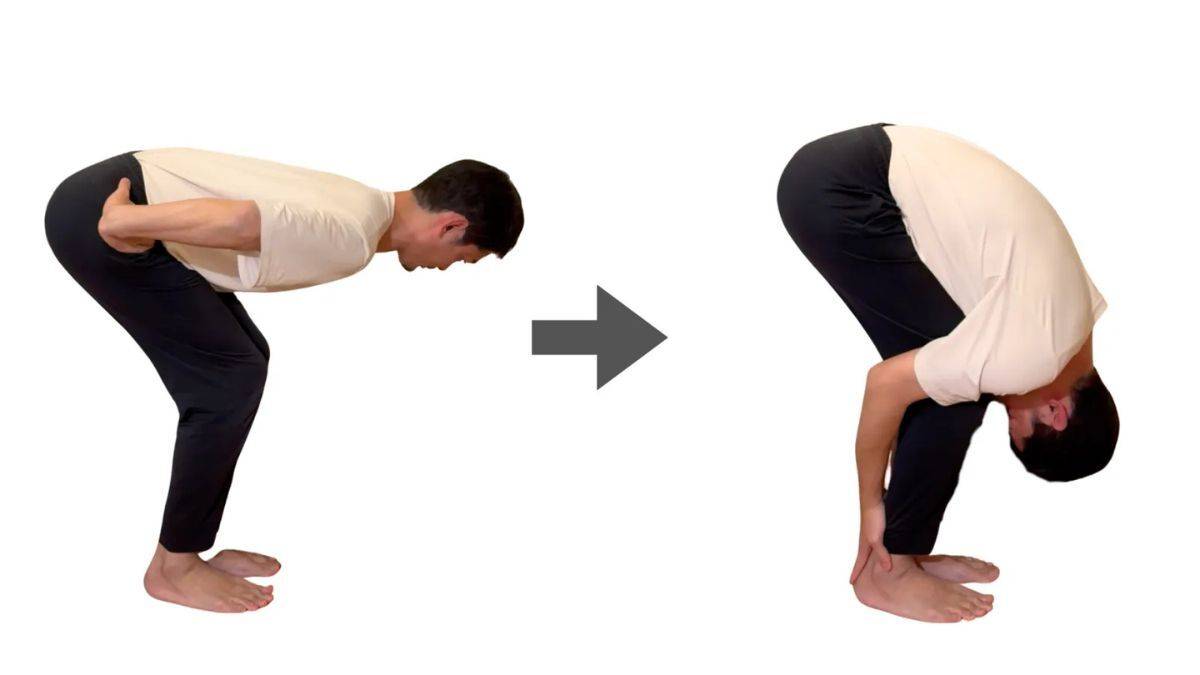 ②鏡などで確認しながら、自分の腰が丸まらないところまで倒れる。90度以下の前屈でもOK。