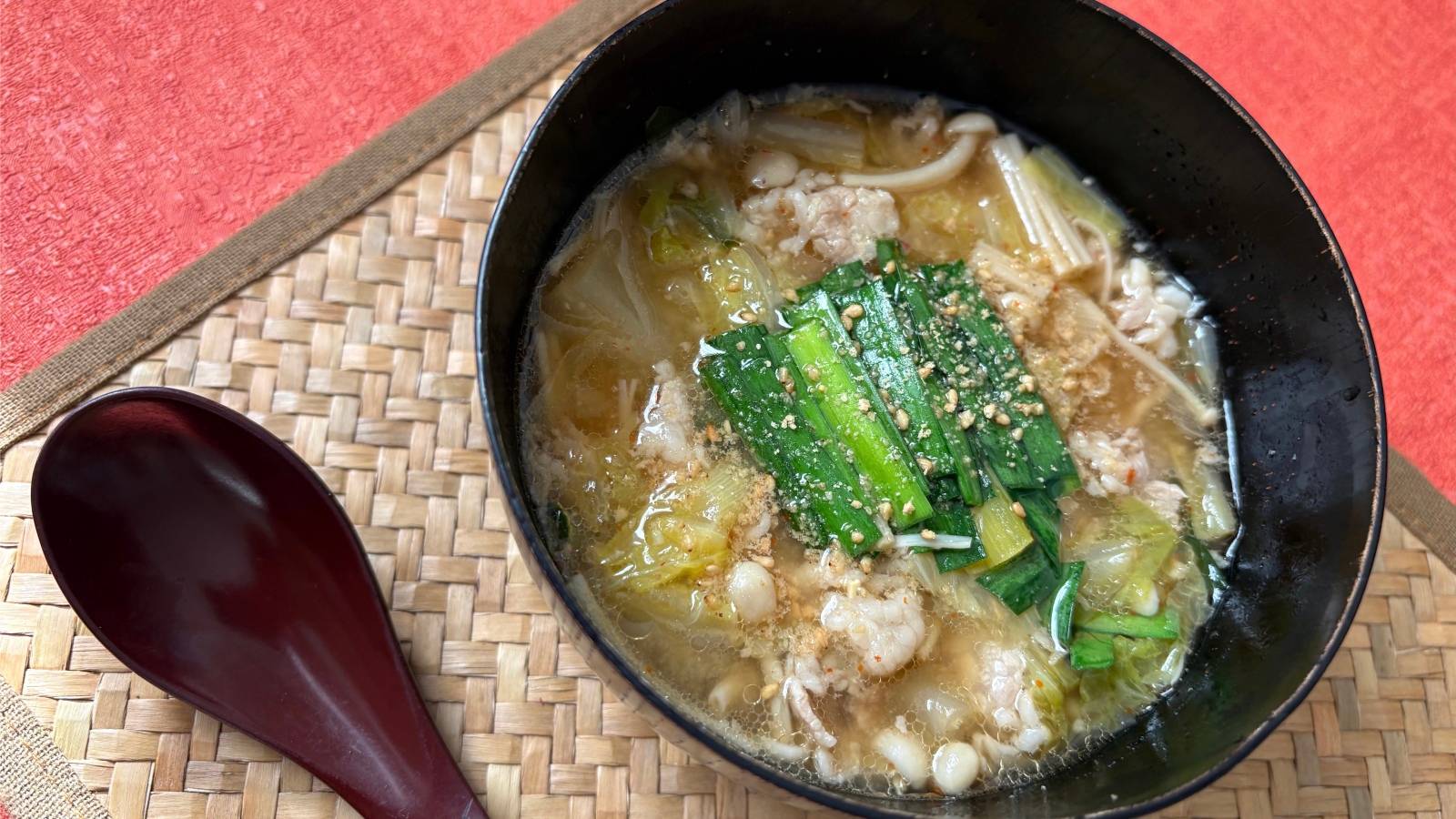 豚肉に豊富なビタミンB1で、糖質の代謝をサポートさせ、白菜・えのき・長ネギなどの野菜は、食物繊維で腸内環境を整えつつ、溜まった水分の代謝をサポート。さらに、生姜・にんにく・ニラ、唐辛子の温め食材で、血流を促し、むくみ・冷え・重だるさのケアにもつながります。