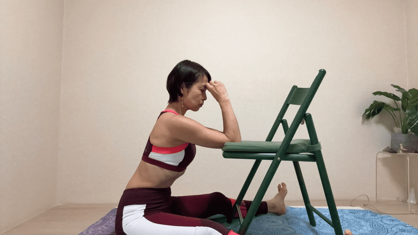 3.ゆっくり前屈していき、額をタオルやクッションにつけます。