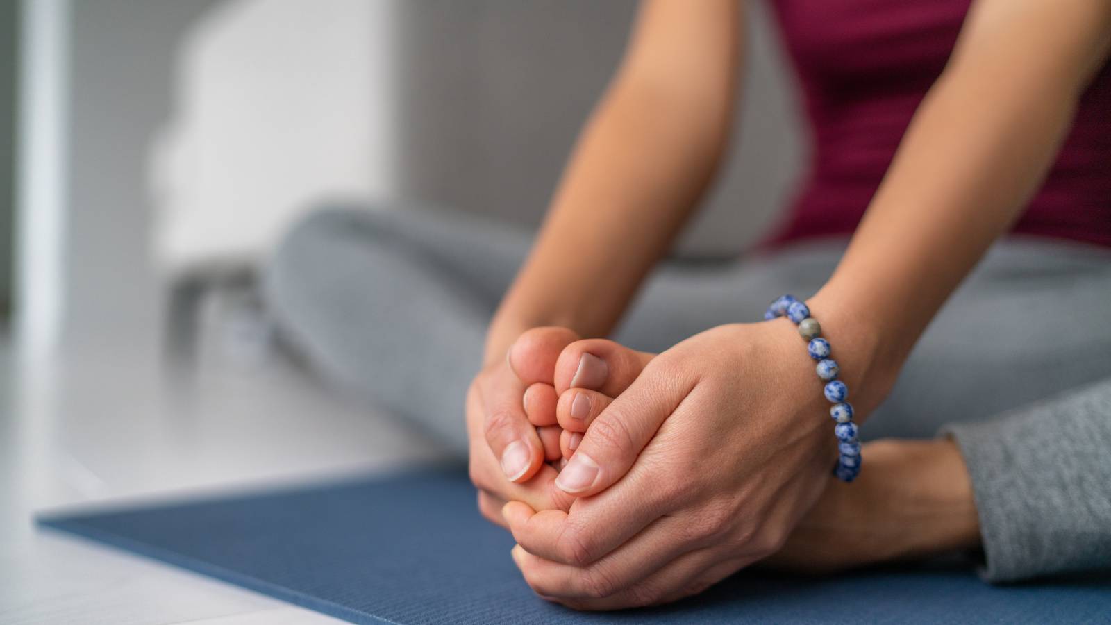 1. 床に座り、あぐらの姿勢で両足の裏を合わせる。かかとを体に引き寄せ、両手で足先を軽くつかむ。