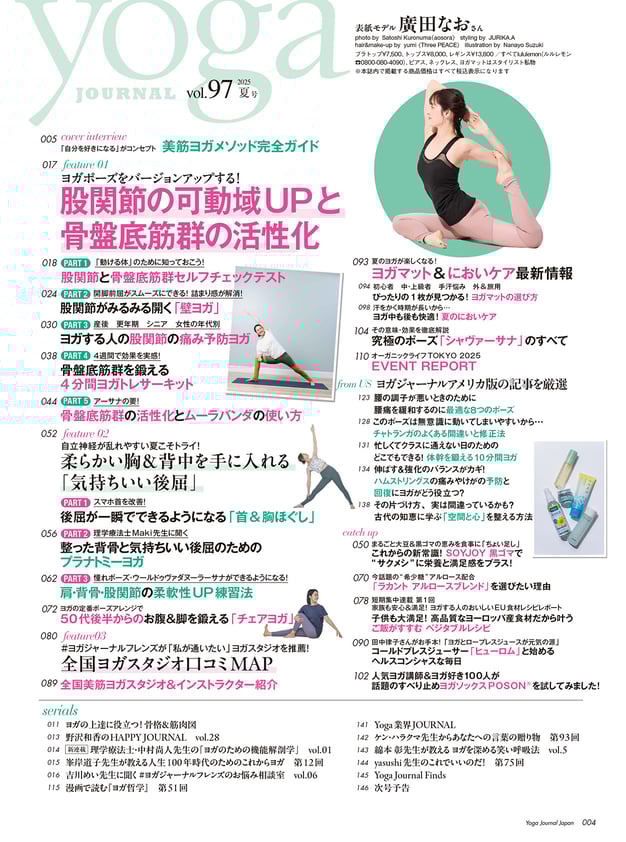 2025年06月20日(金)発売! 税込価格:1,210円股関節や骨盤低筋群は、ライフステージの変化や加齢により変化が表れやすい部位。また、ヨガポーズの完成度にも大きく関わります。いくつになっても歩ける&ヨガが楽しめる体を目指し、股関節の可動域を広げ、骨盤底筋群を活性化する方法を大特集します。そのほか、自律神経と不調が整う後屈練習法、1時間のウオーキングより効率的な50代からのお腹&脚トレーニングなど、盛りだくさんの内容でお届けします!